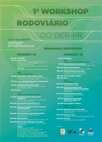 Estão agendadas as participações de especialistas da Universidade Federal do Paraná, Universidade Tecnológica Federal do Paraná, Universidade Federal de Santa Catarina, representantes da Polícia Rodoviária Federal, Polícia Rodoviária Estadual, Observatório Nacional de Segurança Viária, DER/PR, Departamento Nacional de Infraestrutura de Transporte, Banco Interamericano de Desenvolvimento e Associação Paranaense de Engenheiros de Segurança. A programação completa pode ser conferida clicando http://www.der.pr.gov.br/arquivos/File/Eventos/2019/I_workshop_rodoviario/af_DER_Workshop_CartazA3_4x0_4.pdf